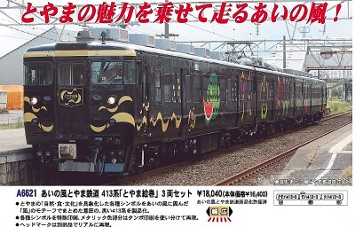 あいの風に因んだ「風」のモチーフでまとめた意匠の黒い413系です。