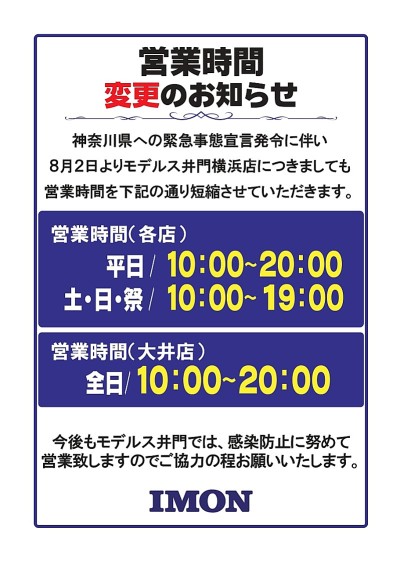 神奈川県の緊急事態宣言発令に伴い、 8月2日よりModels IMON横浜店