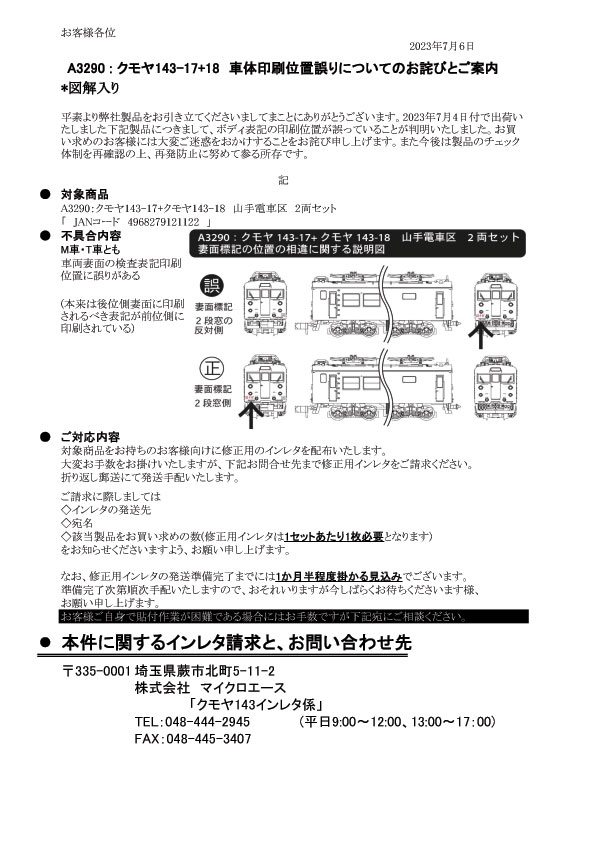 なお、修正用インレタの発送準備完了までには1か月半程度掛かる見込みでございます。