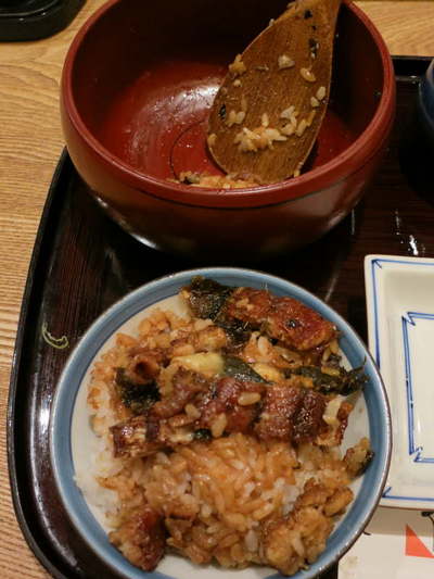 ひつまぶしはまずしゃもじで4分割し、最初の1/4はそのまま食べます。