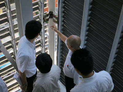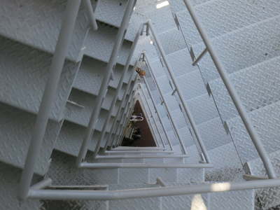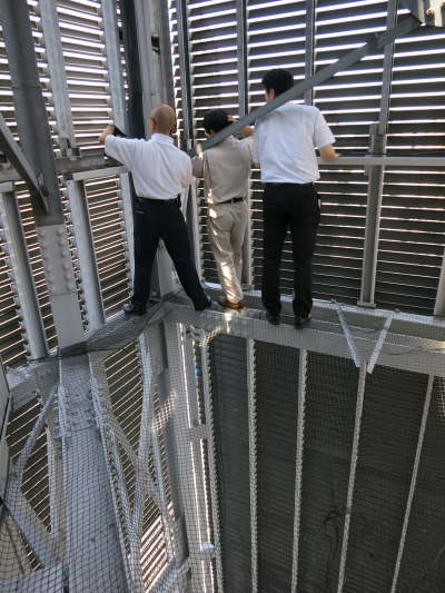 屋上で屋外非常階段上部で鉄骨の構造チェック。