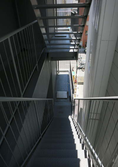 ビルの裏側、屋上排水管の更新を見て下から屋外非常階段を見に行きます。