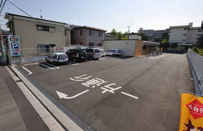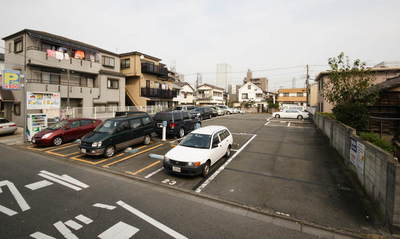 手前にコインパーキング、奥の白い枠が月極駐車場です。