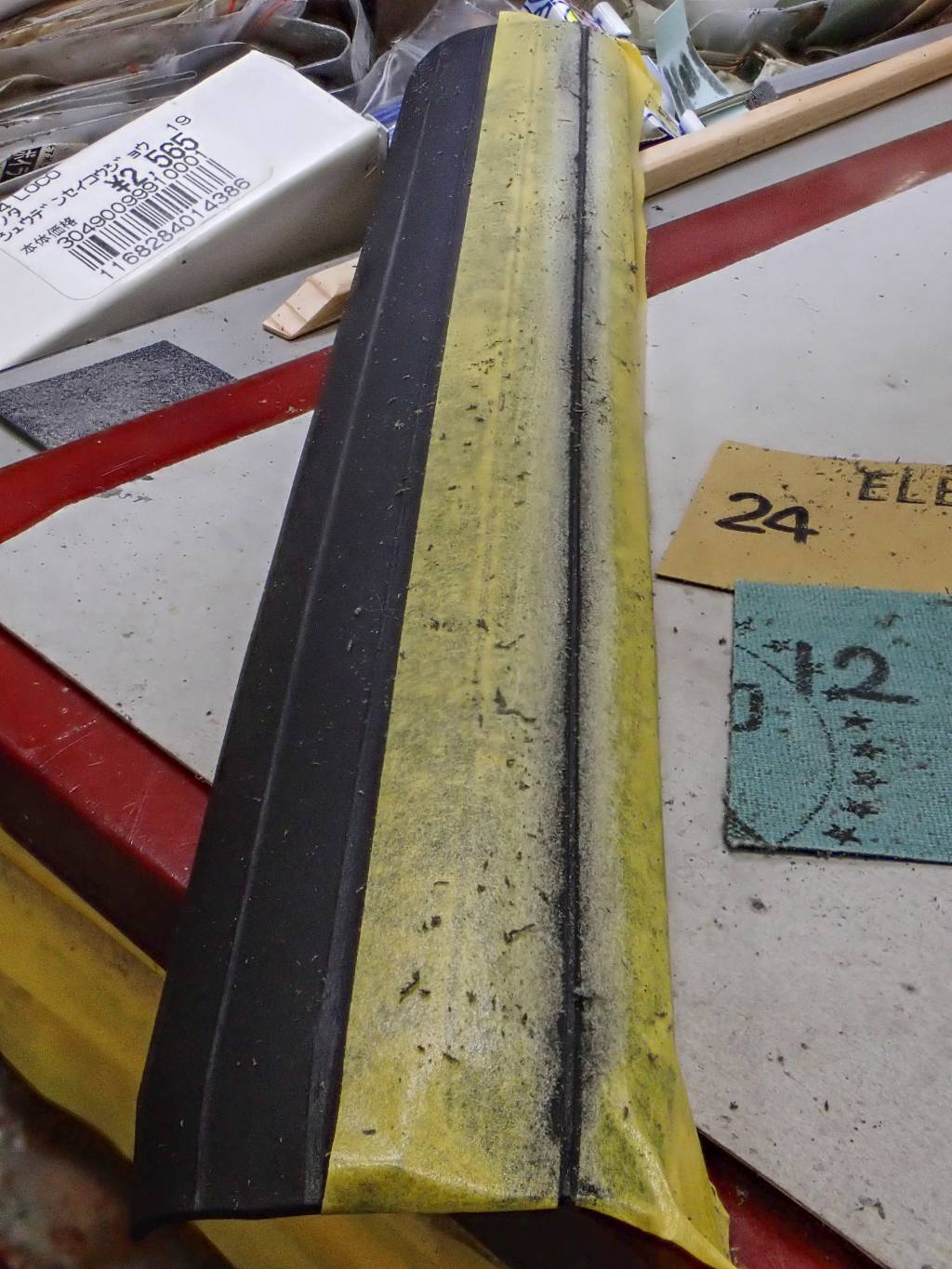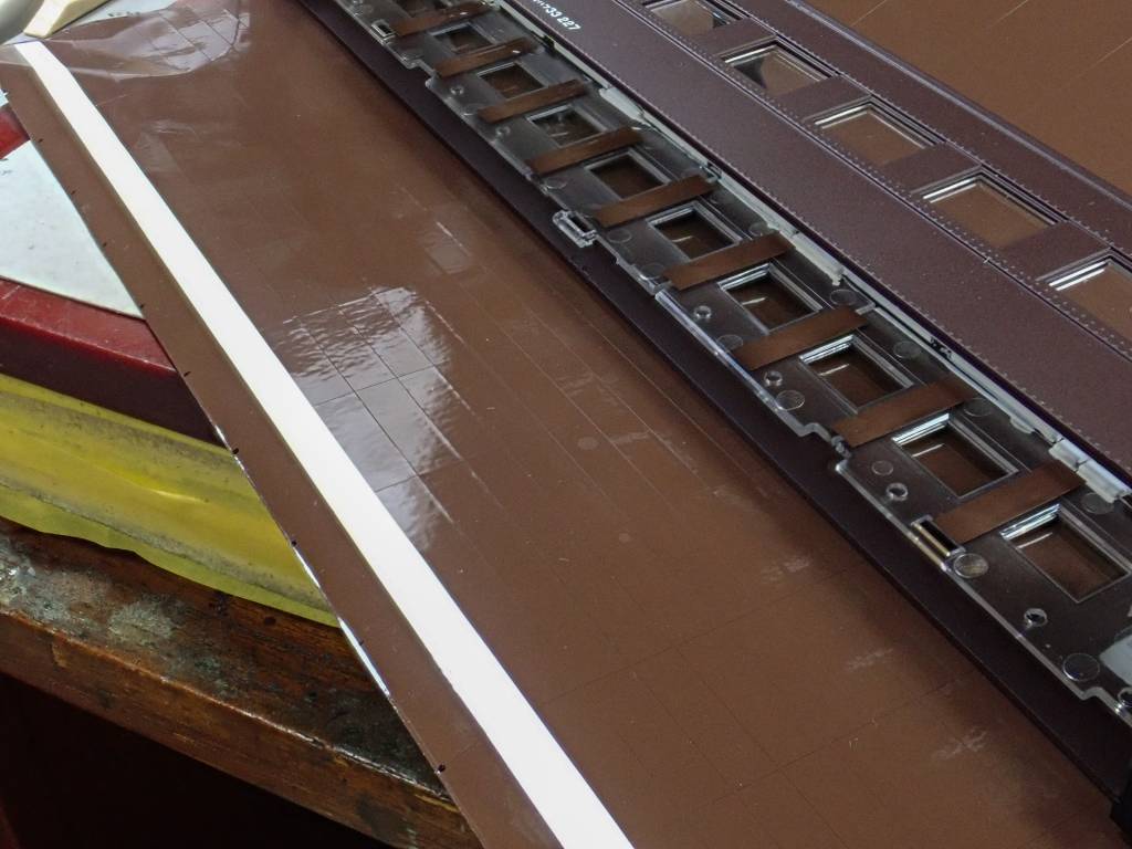 削り過ぎて艶のある帯とその周囲のキャンバス屋根の境がマスキングテープ越しに見えています。