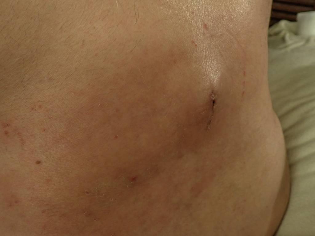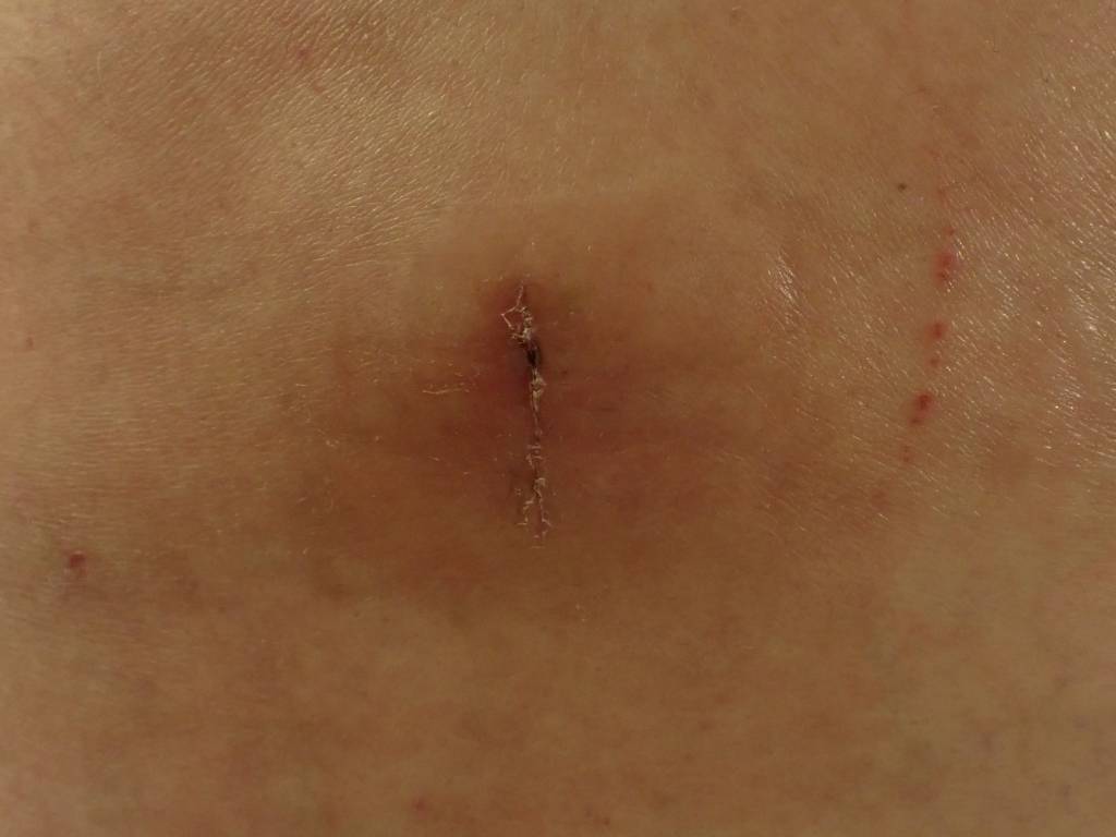 ついに絆創膏が剥がれて手術痕の傷口が見えました。