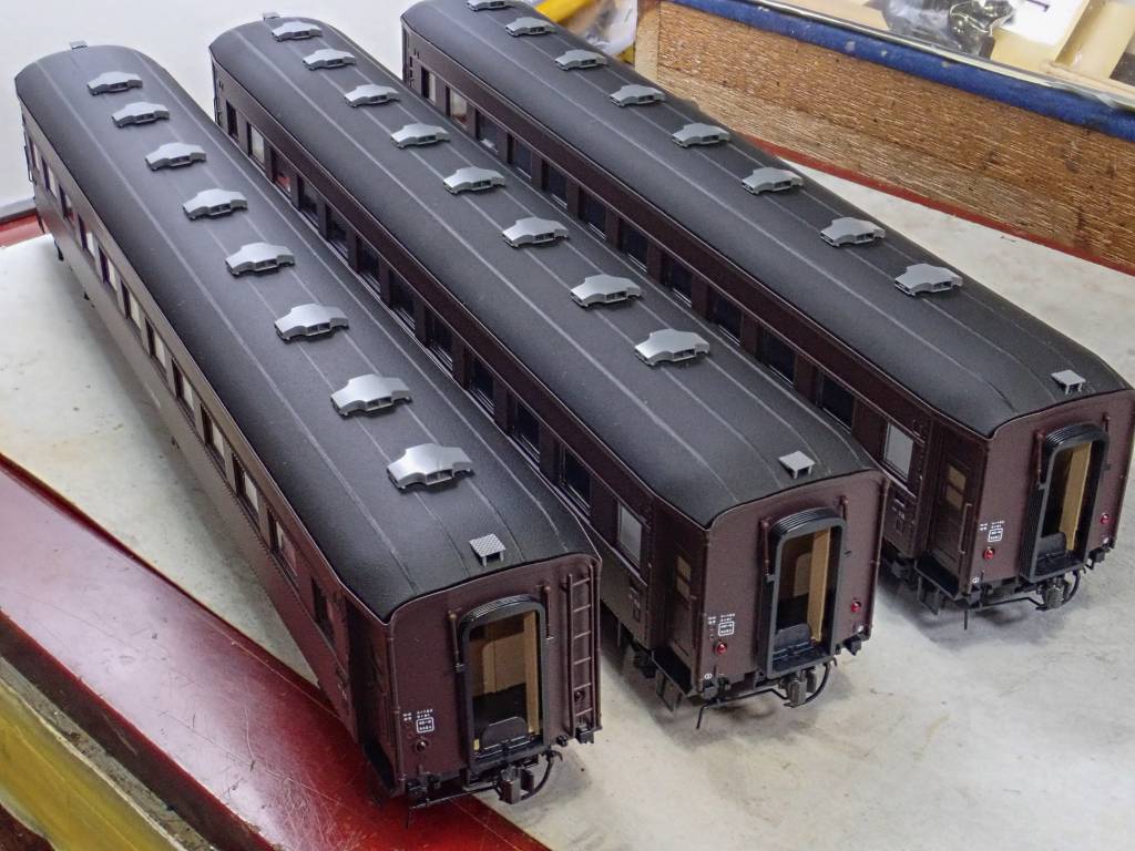 蛍光灯化されたものはそのままとしてこの2両分は薄茶色4号からレッドブラウンに塗り替えます。