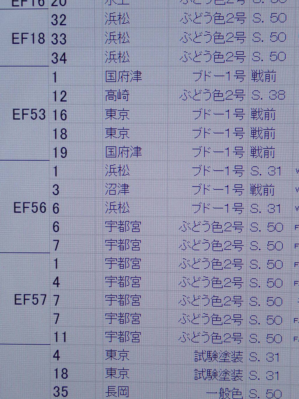 このリストも覗いてみてびっくり、電気機関車には青15号という色は使われておらず、EF58 35 の色名は一般色でした。