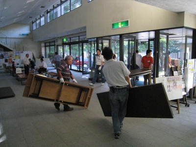 レンタルの机を両方の建物の前に積み上げていきます。