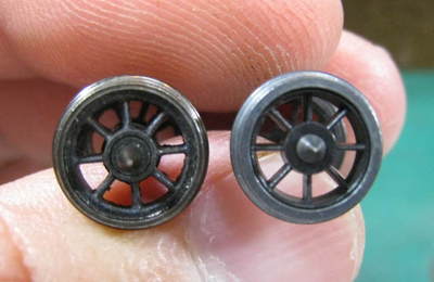 通常のHO1067用車輪(左;径9.8mm)と比較するとこんな感じ(径約9.5mm)です。