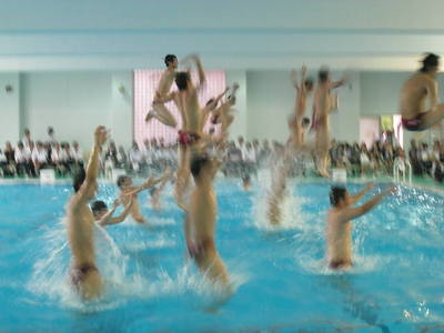 突然ですが印象的な出し物を紹介致します。水泳部の男子シンクロです。