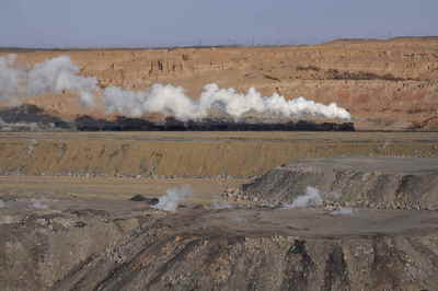 10:46 J地点です。休鉱中の東露天掘を行く石炭運搬列車。
