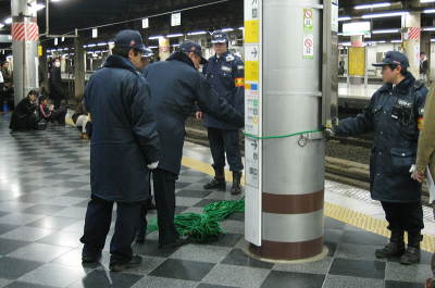 20:36 場所取りで座り込んで居る「鉄」を傍らに警備陣がロープを用意して作戦準備中です。