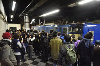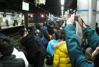 23:17 陸橋上の「撮り鉄」集団が面白いらしく帰宅途中のサラリーマンが携帯で撮影中です。