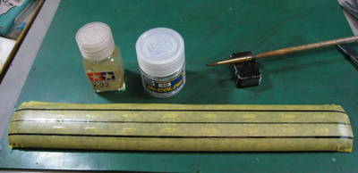屋根キャンバス継ぎ目はもっと「ごつごつ」ムラがある仕上げを目論んでエナメルクリアー(左)ではなくアクリルクリアーを筆塗りしてみることにします。