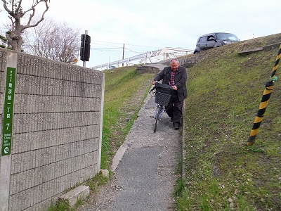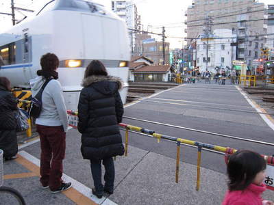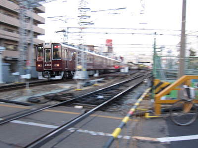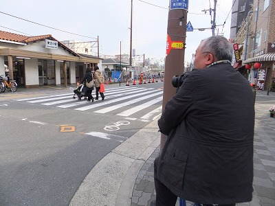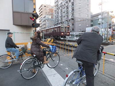 東淀川駅→城東貨物線移動中の淡路の踏切、奥井さんも自転車上から同じ事をしています。