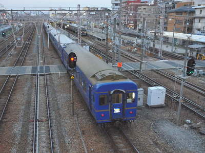 平面交差する線路が見える様に後ずさって発車する準急を撮ります。