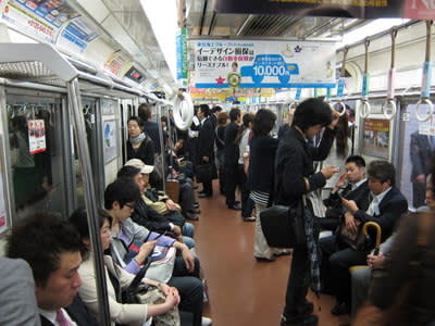 西梅田から始発の四つ橋線ですが、通勤時間ですから混んでいます。