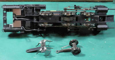 従台車は全車輪集電した電気をモーターへ伝える集電ブラシに下押さえ用バネを兼務させています。