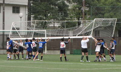 上級生、下級生、コーチみんなでサッカーゴールを所定の位置に移動して練習試合終了です。