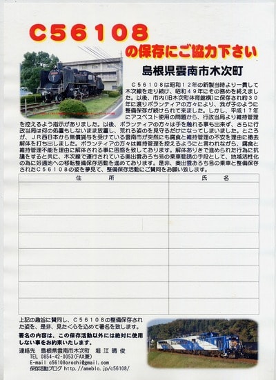 ところで、突然のメールにて申し訳ございませんが、現在、当地では雲南市木次町木次地内に保存されているC56108の突然の解体が話題になっております。