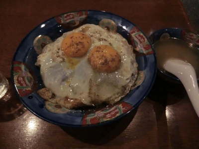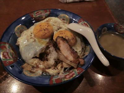 ご飯の上に焼豚(チャーシュー)を載せて「タレ」を掛け、その上に目玉焼き(通常2個目玉、大盛は3個目玉)を載せるのです。