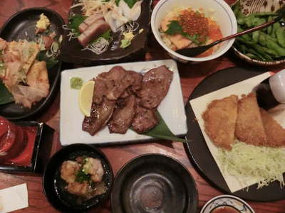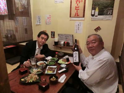 仙台着23:12!「時間が時間」なので料理はすべて注文済みで到着の瞬間宮城の地酒が注がれます。