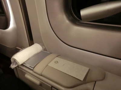 窓側の肘置きに何か挟まっています。 メニューです。