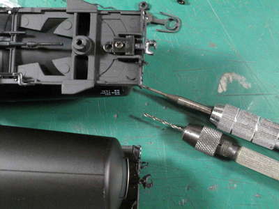 1mmドリルで穴を貫通させ、1.4mmタップを立てて直接ネジ止めする作戦です。