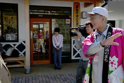 若桜町営バスターミナル。 若桜町観光協会の女性を紹介、テレビカメラ付きです。
