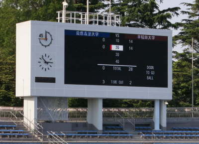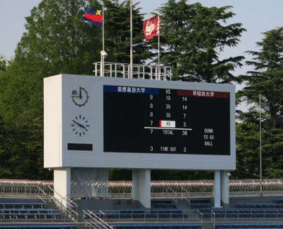 スコアボードの上、早稲田校旗に比べて異状に小さい塾旗、嫌な感じです。