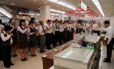 今朝の開店前の朝礼です。 私がしゃべっています。