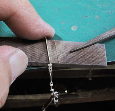機関士側のラジアスロッドはプレスの表側が見えているので、だれた肩を嫌って外側上下側をヤスって平らにします。