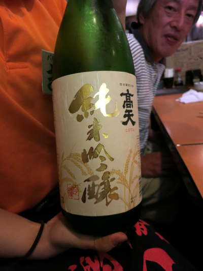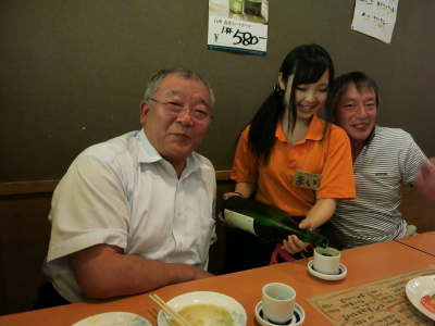 井上君に‘北光正宗純米吟醸’¥580を注ぐあっちゃん(←名札に書いてありました)