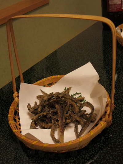 左側天麩羅の大きな白身の魚2つがナマズです。