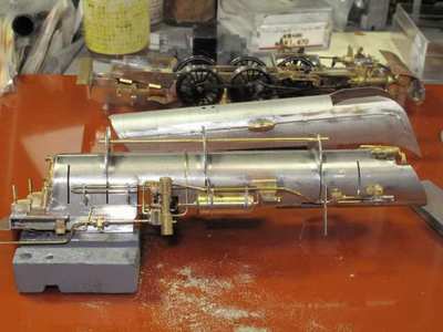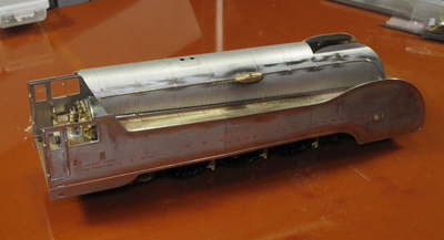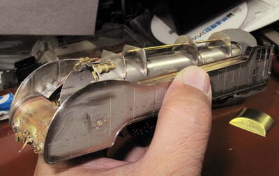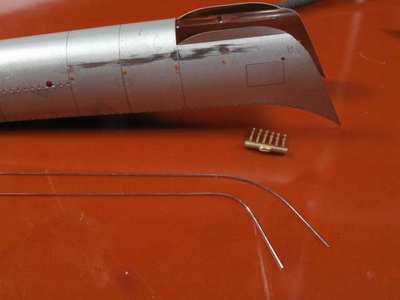 こんどは汽笛を付けます。 実物写真を見るとハンドレールは汽笛取付足に当っている感じです。