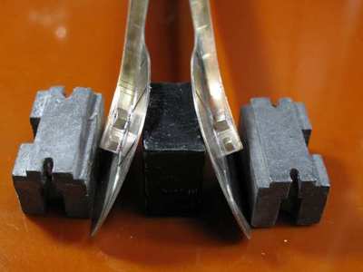 取付足の部分をキサゲ刷毛で磨いて半田が流れて馴染みやすくなるように工夫してから切り落とします。