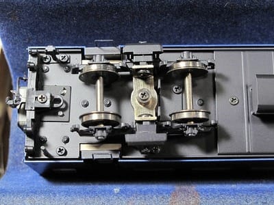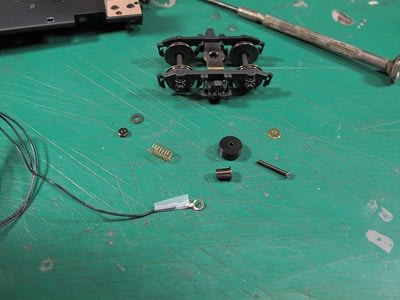 ⑤真鍮製ワッシャ(金メッキ・・・前位後位で直径を変えて3点支持になるようにしています・・・これが無いと台車からの集電がスプリング経由だけになってしまうのです)
