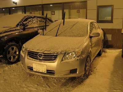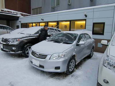 これは我らがレンタカーです。 サンルートの駐車場にて。 まだ雪は時折降っています。
