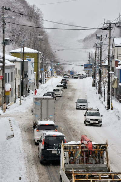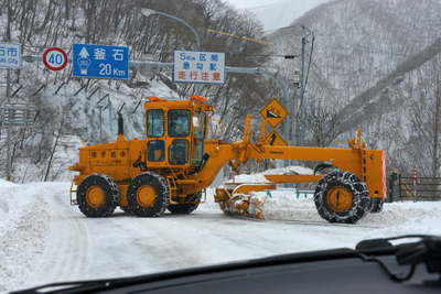 除雪車が道を塞いで方向転換中でした。