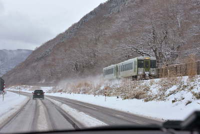遠野発車時と比べて明らかにフロントデッキに雪が多く付いています。
