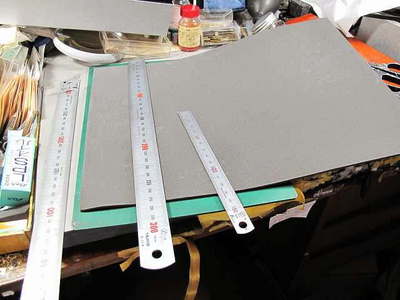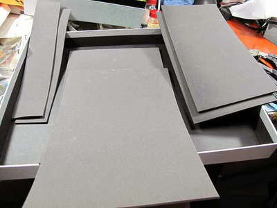 そこで6両用編成箱に使う硬質ウレタンを山森君から貰い、それを切って両面テープで箱に貼る事にします。