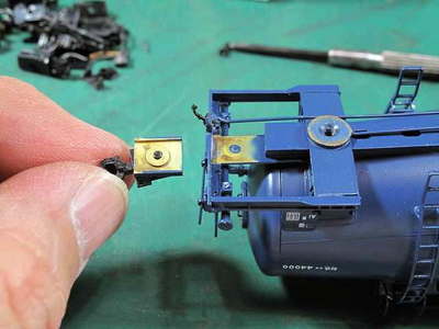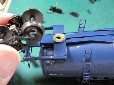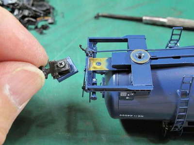 汚し吹き付けの為、台車を外します。 結構大きなワッシャが2枚ずつ挟んであります。