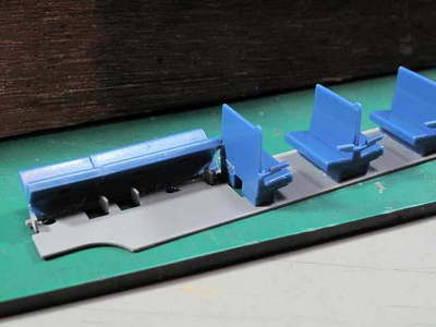 真鍮板の上にIMONのプラ椅子(ハザ椅子とロングシート)が接着されて居り、トイレ仕切りも真鍮板が接着されています。