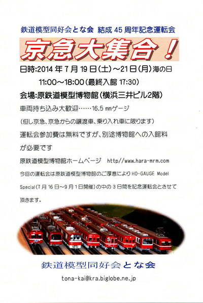 そして「海の日」の3連休、此処で“鉄道模型同好会「とな会」”の結成45周年記念運転会『京急大集合』が開かれました。