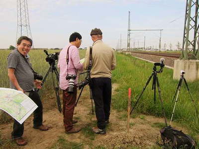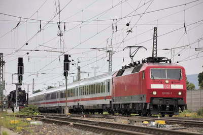 この後ベンスハイムへ向かった。 ここで同時発車がある。 阪上さんと一緒に駅から数百メートルの線路際で三脚を構える。 さすがプロで構図がうまい。 どんどん地元のてつがやってきて我々の後ろで列を作りだいた。 しばらくして後ろの列からドイツ人が一人がやってきて邪魔になるから一緒にラインに入ってくれという。 こっちが先といいたいところだが、郷にはいればなんとやらで、少し下がってドイツ人達と一緒にカメラを構えた。 これでみんなhappyだろというと、全員が笑顔で答えてくれた。 路線はメインラインで次々にICEやICがやってくる。