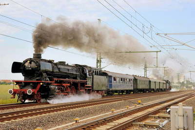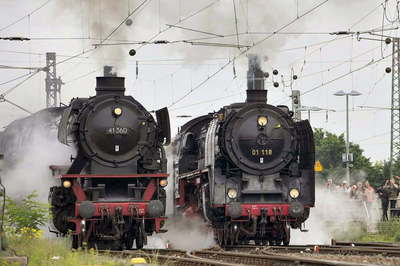 ICEと120の牽くICが通過した後、いよいよ発車時刻の9時3分になった。 直前に高々の二条の煙があがる。 特に41は凄まじい。 汽笛2声、2台の機関車が動き出した。 01は豪快にドレインを切る。 ホームに群がっている‘鉄’が蒸気で見えなくなる。 2台は猛烈にスパート!同時に並んで向かってくるかに見えたが左からやってきた41がぐんぐん前にでる。 肝心の01が隠れがちに目の前を通過していった。 しかしドイツの蒸機のブラスト音は素晴らしく01と41の協奏曲を堪能した。 このあと41型を追いかけて付近で写真を撮った。