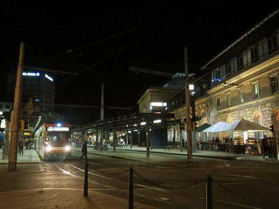 P;井門遅い時間でも走り回っている市電を交わしながらホテルに