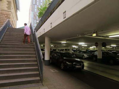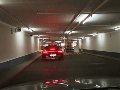 駅前地下駐車場に回ります。 正面に見える建物が駅本屋です。