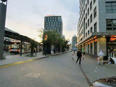 市内電車の中央駅前電停です。 5連接かそれ以上の大きな電車が頻繁に走っています。