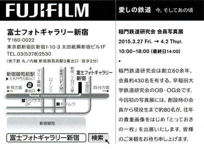 15年02月10日 17:15:00 | 今鉄私も慶應OBなのですが(←なんだか年中「学習院頑張れー!」と叫んでいると母校→学習院みたいな気分になってきます)慶應の宿敵(と言うより母校の次に馴染みが深いところという感じがします・・・その次には六大学!)早稲田の鉄研のOBまで含めた(稻門鉄研)写真展が開かれます。